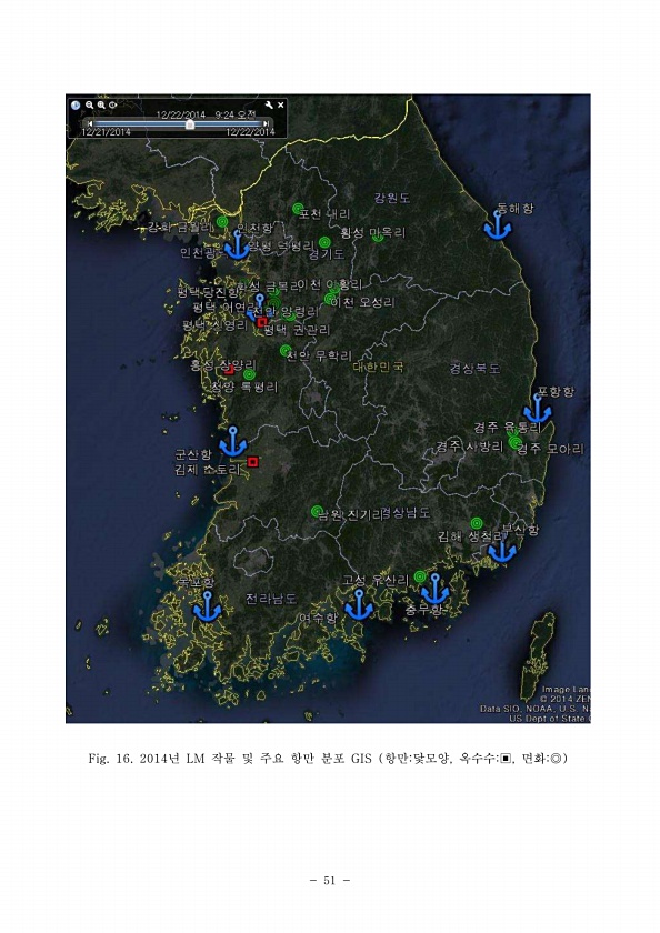 51 Fig. 16. 2014년 LM 작물 및 주요 항만 분포 GIS 항만닻모양, 옥수수▣, 면화◎