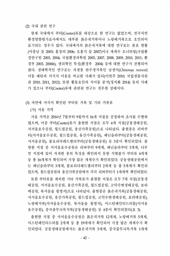42 2 국내 관련 연구 현재 국내에서 쿠터 Cooter 류를 대상으로 한 연구는 없었으며, 전국자연 환경영향평가조사에서도 대부분 붉은귀거북이나 노랑배거북으로 오인되어 표기되는 경우가 많다. 국내에서의 붉은귀거북에 대한 연구로는 분포 현황 이종남 등 2003; 홍창의 2006; 오홍식 등 2007 이나 개체수 모니터링 국립환 경연구원 2003, 2004; 국립환경과학원 2005, 2007, 2008, 2009, 2010, 2011; 환 경부 2003, 2006b , 생리학인 특성 환경부 2004 등에 대한 연구가 진행되어 왔다. 생태학적인 연구로는 자생종 반수생거북인 남생이 Chinemys reevesii 이동 패턴과 서식지 이용을 비교한 사례가 있다 이헌주 2010; 국립생물자원 관 2010, 2011, ...