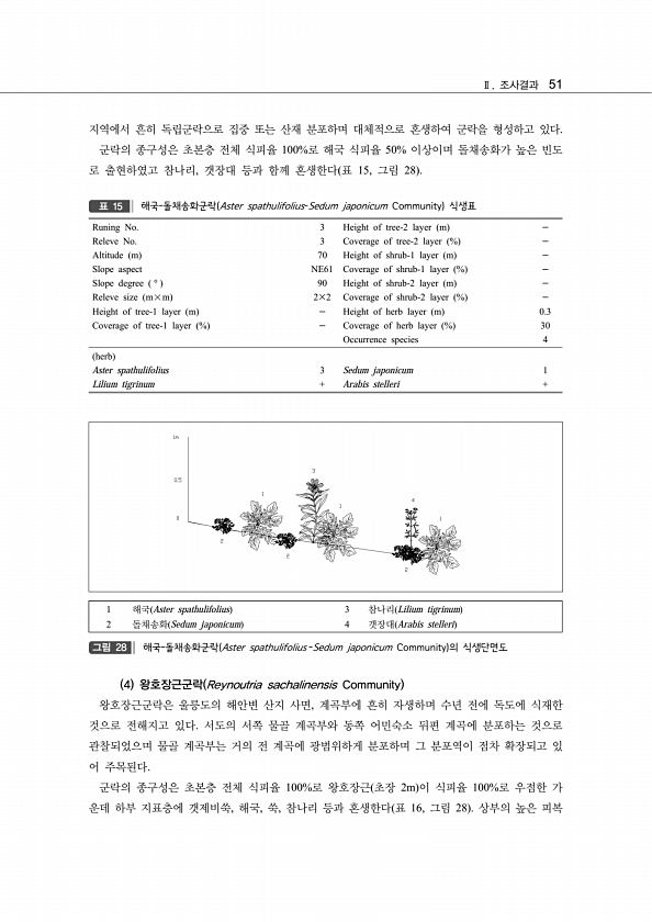 Ⅱ. 조사결과 51 지역에서 흔히 독립군락으로 집중 또는 산재 분포하며 대체적으로 혼생하여 군락을 형성하고 있다. 군락의 종구성은 초본층 전체 식피율 100%로 해국 식피율 50% 이상이며 돌채송화가 높은 빈도 로 출현하였고 참나리, 갯장대 등과 함께 혼생한다 표 15, 그림 28 Runing No. 3 Height of tree-2 layer m - Releve No. 3 Coverage of tree-2 layer % - Altitude m 70 Height of shrub-1 layer m - Slope aspect NE61 Coverage of shrub-1 layer % - Slope degree ° 90 Height of shrub-2 layer m - Releve size m×m 2×2 Cove...