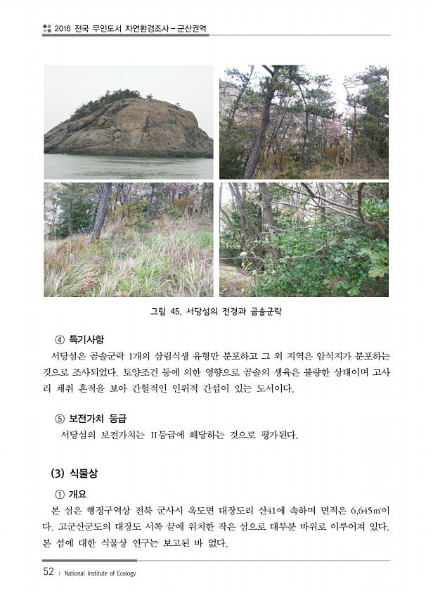 2016 전국 무인도서 자연환경조사 군산권역 52 ? National Institute of Ecology 그림 45. 서당섬의 전경과 곰솔군락 ④ 특기사항 서당섬은 곰솔군락 1개의 삼림식생 유형만 분포하고 그 외 지역은 암석지가 분포하는 것으로 조사되었다. 토양조건 등에 의한 영향으로 곰솔의 생육은 불량한 상태이며 고사 리 채취 흔적을 보아 간헐적인 인위적 간섭이 있는 도서이다. ⑤ 보전가치 등급 서당섬의 보전가치는 Ⅱ등급에 해당하는 것으로 평가된다. 3 식물상 ① 개요 본 섬은 행정구역상 전북 군사시 옥도면 대장도리 산41에 속하며 면적은 6,645㎡이 다. 고군산군도의 대장도 서쪽 끝에 위치한 작은 섬으로 대부분 바위로 이루어져 있다. 본 섬에 대한 식물상 연구는 보고된 바없다.