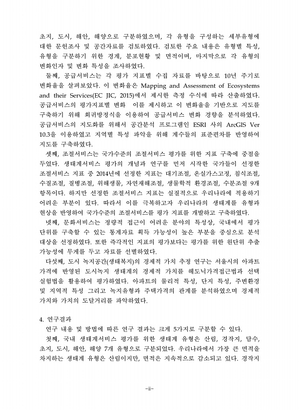 -ii- 초지 도시 해안 해양으로 구분하였으며 각 유형을 구성하는 세부유형에 대한 문헌조사 및 공간자료를 검토하였다 검토한 주요 내용은 유형별 특성 유형을 구분하기 위한 경계 분포현황 및 면적이며 마지막으로 각 유형의 변화인자 및 변화 특성을 조사하였다 둘째 공급서비스는 각 평가 지표별 수집 자료를 바탕으로 년 주기로 변화율을 살펴보았다 이 변화율은 에서 제시한 측정 수식에 따라 산출하였다 공급서비스의 평가지표별 변화 이를 제시하고 이 변화율을 기반으로 지도를 구축하기 위해 회귀방정식을 이용하여 공급서비스 변화 경향을 분석하였다 공급서비스의 지도화를 위해서 공간분석 프로그램인 사의 을 이용하였고 지역별 특성 파악을 위해 계수들의 표준편차를 반영하여 지도를 구축하였다 셋째 조절서비스는 국가수준의 조절서비스 평...