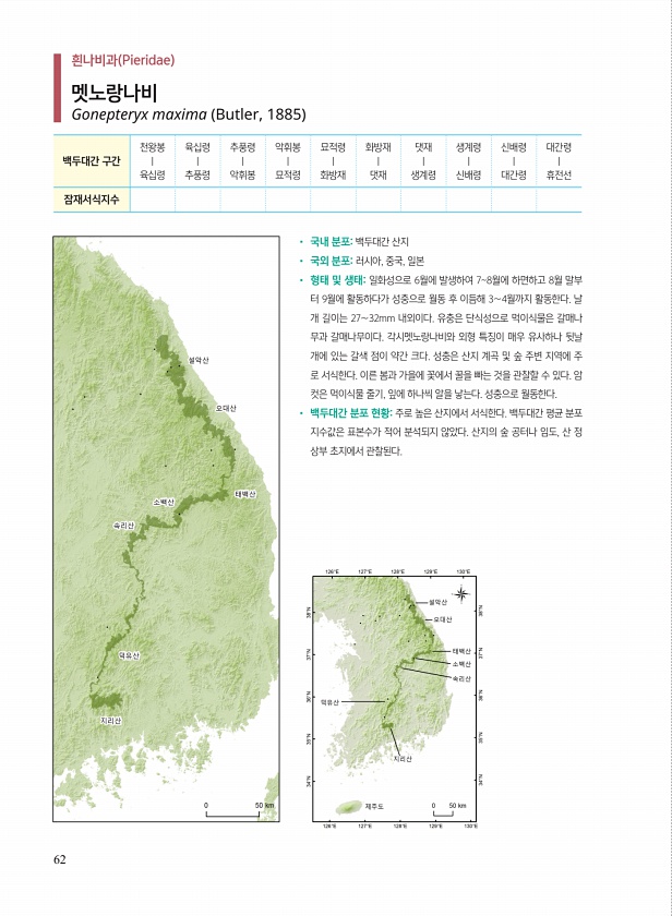 62 ? 국내 분포백두대간 산지 ? 국외 분포러시아, 중국, 일본 ? 형태 및 생태일화성으로 6월에 발생하여 78월에 하면하고 8월 말부 터 9월에 활동하다가 성충으로 월동 후 이듬해 3∼4월까지 활동한다. 날 개 길이는 27∼32mm 내외이다. 유충은 단식성으로 먹이식물은 갈매나 무과 갈매나무이다. 각시멧노랑나비와 외형 특징이 매우 유사하나 뒷날 개에 있는 갈색 점이 약간 크다. 성충은 산지 계곡 및 숲 주변 지역에 주 로 서식한다. 이른 봄과 가을에 꽃에서 꿀을 빠는 것을 관찰할 수 있다. 암 컷은 먹이식물 줄기, 잎에 하나씩 알을 낳는다. 성충으로 월동한다. ? 백두대간 분포 현황주로 높은 산지에서 서식한다. 백두대간 평균 분포 지수값은 표본수가 적어 분석되지 않았다. 산지의 숲 공터나 임도, 산 정 ...