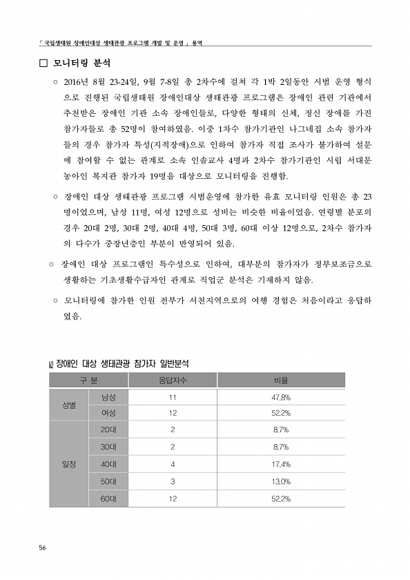 ?국립생태원 장애인대상 생태관광 프로그램 개발 및 운영? 용역 56 □ 모니터링 분석 ? 2016년 8월 23-24일, 9월 7-8일 총 2차수에 걸쳐 각 1박 2일동안 시범 운영 형식 으로 진행된 국립생태원 장애인대상 생태관광 프로그램은 장애인 관련 기관에서 추천받은 장애인 기관 소속 장애인들로, 다양한 형태의 신체, 정신 장애를 가진 참가자들로 총 52명이 참여하였음. 이중 1차수 참가기관인 나그네집 소속 참가자 들의 경우 참가자 특성 지적장애 으로 인하여 참가자 직접 조사가 불가하여 설문 에 참여할 수 없는 관계로 소속 인솔교사 4명과 2차수 참가기관인 시립 서대문 농아인 복지관 참가자 19명을 대상으로 모니터링을 진행함. ? 장애인 대상 생태관광 프로그램 시범운영에 참가한 유효 모니터링 인원은 총 2...