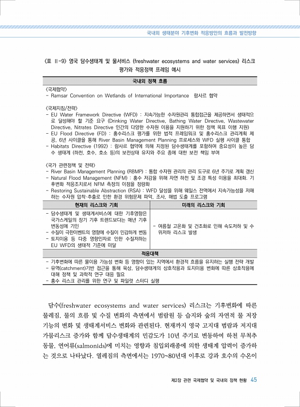 국내외 생태분야 기후변화 적응방안의 흐름과 발전방향 제2장 관련 국제협약 및 국내외 정책 현황 45 국내외 정책 흐름 국제협약 Ramsar Convention on Wetlands of International Importance 람사르 협약 국제지침/전략 EU Water Framework Directive WFD 지속가능한 수자원관리 통합접근을 제공하면서 생태적으 로 달성해야 할 기준 요구 Drinking Water Directive, Bathing Water Directive, Wastewater Directive, Nitrates Directive 인간의 다양한 수자원 이용을 지원하기 위한 정책 목표 이행 지원 EU Flood Directive FD 홍수리스크 평가를 위한 법적 프레임워크 및 홍수리스크...