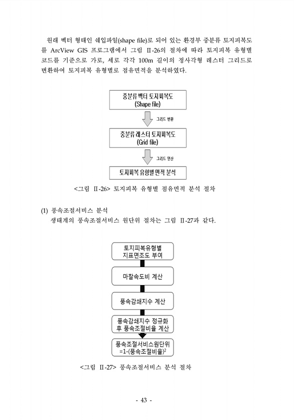 원래 벡터 형태인 쉐입파일 로 되어 있는 환경부 중분류 토지피복도 를 프로그램에서 그림 의 절차에 따라 토지피복 유형별 코드를 기준으로 가로 세로 각각 길이의 정사각형 레스터 그리드로 변환하여 토지피복 유형별로 점유면적을 분석하였다 그림 토지피복 유형별 점유면적 분석 절차 풍속조절서비스 분석 생태계의 풍속조절서비스 원단위 절차는 그림 과 같다 그림 풍속조절서비스 분석절차