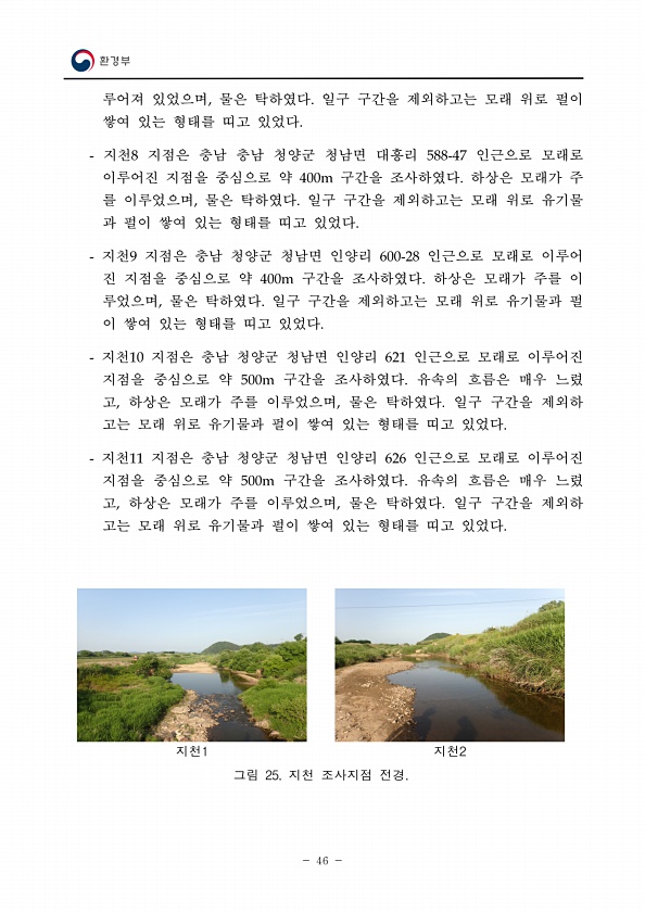 46 루어져 있었으며, 물은 탁하였다. 일구 구간을 제외하고는 모래 위로 펄이 쌓여 있는 형태를 띠고 있었다. 지천8 지점은 충남 충남 청양군 청남면 대흥리 588-47 인근으로 모래로 이루어진 지점을 중심으로 약 400m 구간을 조사하였다. 하상은 모래가 주 를 이루었으며, 물은 탁하였다. 일구 구간을 제외하고는 모래 위로 유기물 과 펄이 쌓여 있는 형태를 띠고 있었다. 지천9 지점은 충남 청양군 청남면 인양리 600-28 인근으로 모래로 이루어 진 지점을 중심으로 약 400m 구간을 조사하였다. 하상은 모래가 주를 이 루었으며, 물은 탁하였다. 일구 구간을 제외하고는 모래 위로 유기물과 펄 이 쌓여 있는 형태를 띠고 있었다. 지천10 지점은 충남 청양군 청남면 인양리 621 인근으로 모래로 이루어진 지점...