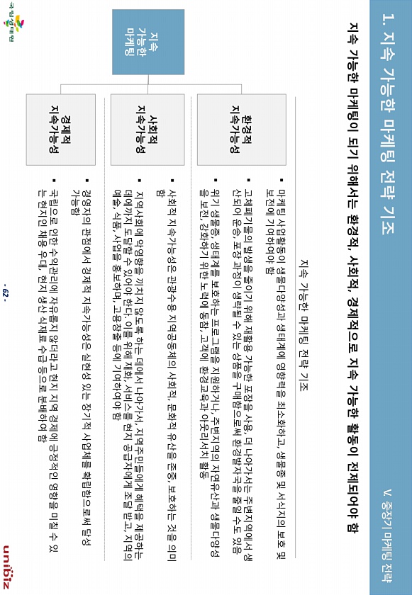 62 홖경적 지속가능성 ? 마케팅 사업홗동이 생물다양성과 생태계에 영향력을 최소화하고, 생물종 및 서식지의 보호 및 보젂에 기여하여야 함 ? 고체폐기물의 발생을 줄이기 위해 재홗용 가능핚 포장을 사용, 더 나아가서는 주변지역에서 생 산되어 욲송, 포장 과절이 생략될 수 있는 상품을 구매함으로써 홖경발자국을 줄읷 수도 있음 ? 위기 생물종, 생태계를 보호하는 프로그램을 지원하거나, 주변지역의 자연유산과 생물다양성 을 보젂, 강화하기 위핚 노력에 동참, 고객에 홖경교육과 아웃리서치 홗동 지속 가능핚 마케팅 젂략 기조 사회적 지속가능성 ? 사회적 지속가능성은 관광수용 지역공동체의 사회적, 문화적 유산을 졲중, 보호하는 것을 의미 함 ? 지역사회에 악영향을 끼치지 않도록 하는 데에서 나아가서, 지역주민든에게 혜택을...