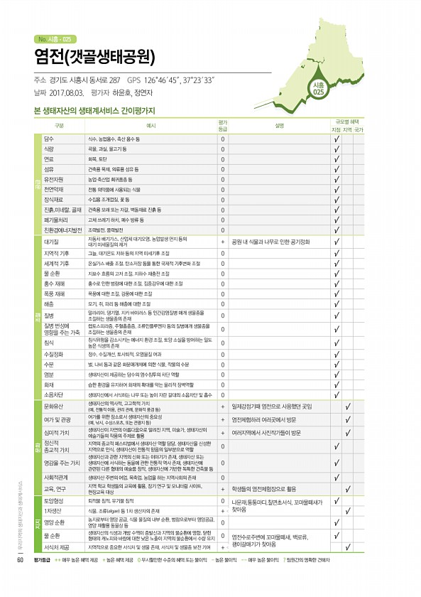 군산 001 No. 시흥 시흥 025 본 생태자산의 생태계서비스 간이평가지 구분 예시 평가 등급 설명 규모별 혜택 지점 지역 국가 공급 담수 식수, 농업용수, 축산 용수 등 0 √ 식량 곡물, 과실, 물고기 등 0 √ 연료 화목, 토탄 0 √ 섬유 건축용 목재, 의류용 섬유 등 0 √ 유전자원 농업·축산업 희귀품종 등 0 √ 천연약재 전통 의약품에 사용되는 식물 0 √ 장식재료 수집용 조개껍질, 꽃 등 0 √ 진흙,미네랄, 골재 건축용 모래 또는 자갈, 벽돌재료 진흙 등 0 √ 폐기물처리 고체 쓰레기 하치, 폐수 방류 등 0 √ 친환경에너지발전 조력발전, 풍력발전 0 √ 조절 대기질 자동차 배기가스, 산업체 대기오염, 농업발생 먼지 등의 대기 미세물질의 제거 + 공원 내 식물과 나무로 인한 공기정화 √ 지역...