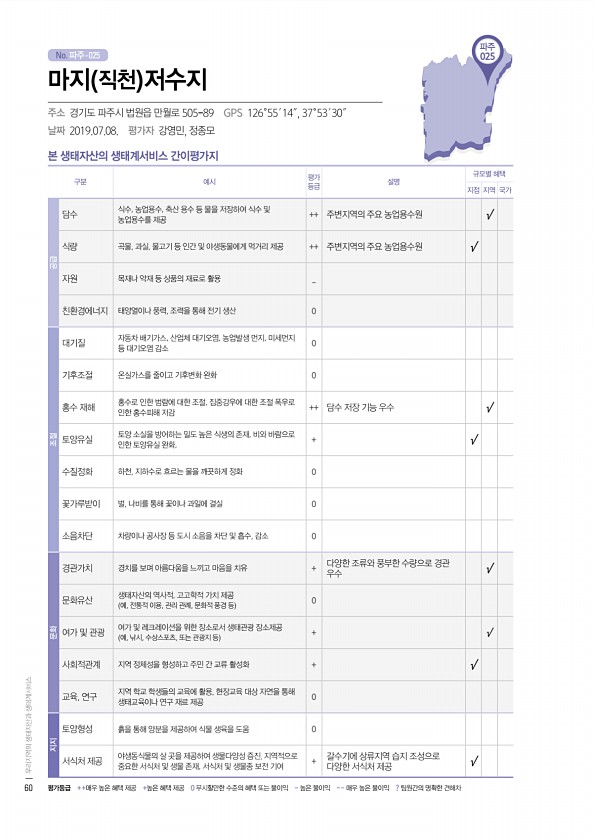 No. 파주- 파주 025 본 생태자산의 생태계서비스 간이평가지 구분 예시 평가 등급 설명 규모별 혜택 지점 지역 국가 공급 담수 식수, 농업용수, 축산 용수 등 물을 저장하여 식수 및 농업용수를 제공 ++ 주변지역의 주요 농업용수원 √ 식량 곡물, 과실, 물고기 등 인간 및 야생동물에게 먹거리 제공 ++ 주변지역의 주요 농업용수원 √ 자원 목재나 약재 등 상품의 재료로 활용 _ 친환경에너지 태양열이나 풍력, 조력을 통해 전기 생산 0 조절 대기질 자동차 배기가스, 산업체 대기오염, 농업발생 먼지, 미세먼지 등 대기오염 감소 0 기후조절 온실가스를 줄이고 기후변화 완화 0 홍수 재해 홍수로 인한 범람에 대한 조절, 집중강우에 대한 조절 폭우로 인한 홍수피해 저감 ++ 담수 저장 기능 우수 √ 토양유실 토양 ...