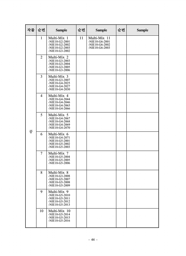 44 작물 순번 Sample 순번 Sample 순번 Sample 콩 1 Multi-Mix 1 -NIE18-G2-2001 -NIE18-G2-2002 -NIE18-G2-2003 -NIE18-G3-2002 11 Multi-Mix 11 -NIE18-G6-2001 -NIE18-G6-2002 -NIE18-G6-2003 2 Multi-Mix 2 -NIE18-G3-2003 -NIE18-G3-2004 -NIE18-G3-2005 -NIE18-G3-2006 3 Multi-Mix 3 -NIE18-G3-2007 -NIE18-G4-2025 -NIE18-G4-2027 -NIE18-G4-2030 4 Multi-Mix 4 -NIE18-G4-2044 -NIE18-G4-2046 -NIE18-G4-2065 -NIE18-G4-2066 5 Mul...