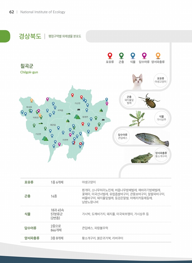 경상북도 행정구역별 외래생물 분포도 포유류 야생고양이 북삼읍 약목면 석적읍 왜관읍 기산면 가산면 동명면 지천면 칠곡군 Chilgok-gun 양서파충류 황소개구리 포유류 1종 6개체 야생고양이 곤충 14종 흰개미, 소나무허리노린재, 버즘나무방패벌레, 해바라기방패벌레, 꽃매미, 미국선녀벌레, 유럽좁쌀바구미, 큰뚱보바구미, 알팔파바구미, 벼물바구미, 돼지풀잎벌레, 등검은말벌, 아메리카동애등에, 남방노랑나비 식물 18과 45속 57분류군 2변종 가시박, 도깨비가지, 돼지풀, 미국쑥부쟁이, 가시상추 등 담수어류 2종으로 846개체 큰입배스, 파랑볼우럭 양서파충류 3종 8개체 황소개구리, 붉은귀거북, 리버쿠터 포유류 곤충 식물 담수어류 양서파충류 담수어류 큰입배스 식물 가시상추 곤충 돼지풀잎 벌레 62 National...