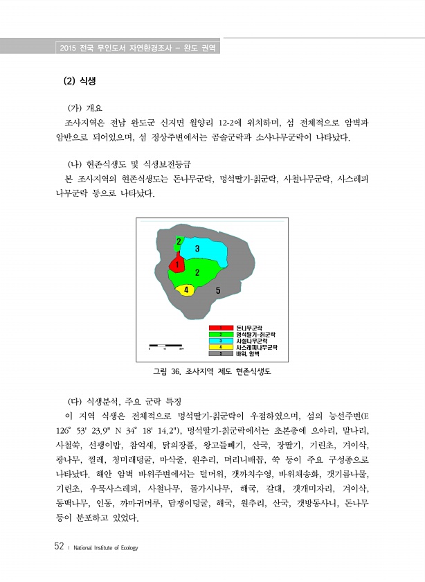 2015 전국 무인도서 자연환경조사 완도 권역 52 ? National Institute of Ecology 2 식생 가 개요 조사지역은 전남 완도군 신지면 월양리 12-2에 위치하며, 섬 전체적으로 암벽과 암반으로 되어있으며, 섬 정상주변에서는 곰솔군락과 소사나무군락이 나타났다. 나 현존식생도 및 식생보전등급 본 조사지역의 현존식생도는 돈나무군락, 멍석딸기-칡군락, 사철나무군락, 사스레피 나무군락 등으로 나타났다. 그림 36. 조사지역 제도 현존식생도 다 식생분석, 주요 군락 특징 이 지역 식생은 전체적으로 멍석딸기-칡군락이 우점하였으며, 섬의 능선주변 E 126。5323.9N 34。1814.2, 멍석딸기-칡군락에서는 초본층에 으아리, 말나리, 사철쑥, 선괭이밥, 참억새, 닭의장풀, 왕고들빼기, 산국, 장...