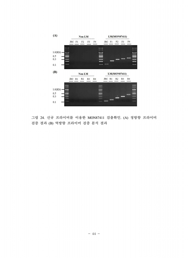 44 그림 24. 신규 프라이머를 이용한 MON87411 검출확인. A 정방향 프라이머 검증 결과 B 역방향 프라이머 검증 분석결과