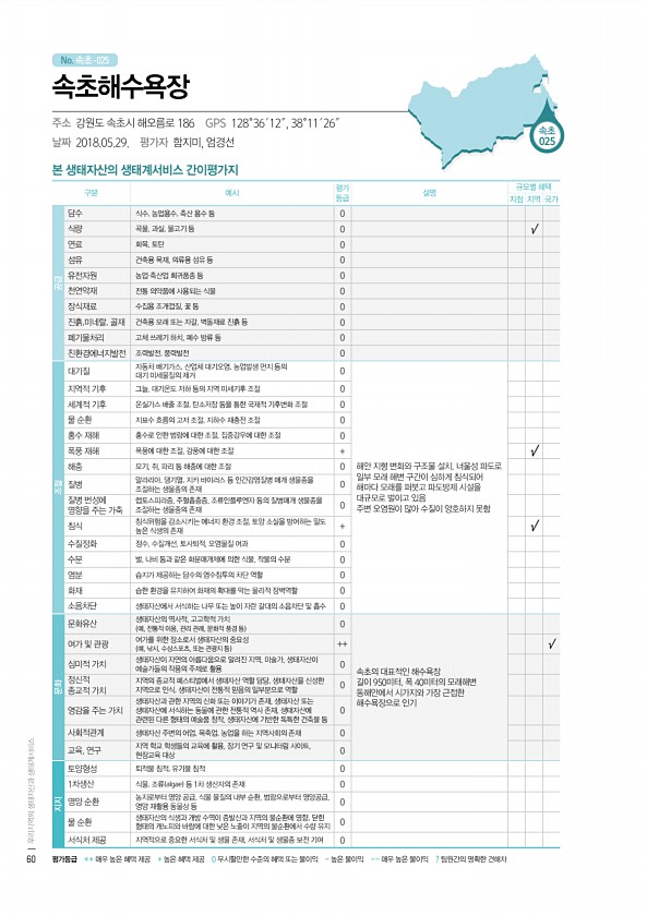 No. 속초- 본 생태자산의 생태계서비스 간이평가지 구분 예시 평가 등급 설명 규모별 혜택 지점 지역 국가 공급 담수 식수, 농업용수, 축산 용수 등 0 식량 곡물, 과실, 물고기 등 0 √ 연료 화목, 토탄 0 섬유 건축용 목재, 의류용 섬유 등 0 유전자원 농업·축산업 희귀품종 등 0 천연약재 전통 의약품에 사용되는 식물 0 장식재료 수집용 조개껍질, 꽃 등 0 진흙,미네랄, 골재 건축용 모래 또는 자갈, 벽돌재료 진흙 등 0 폐기물처리 고체 쓰레기 하치, 폐수 방류 등 0 친환경에너지발전 조력발전, 풍력발전 0 조절 대기질 자동차 배기가스, 산업체 대기오염, 농업발생 먼지 등의 대기 미세물질의 제거 0 해안 지형 변화와 구조물 설치, 너울성 파도로 일부 모래 해변 구간이 심하게 침식되어 해마다 모래를 ...