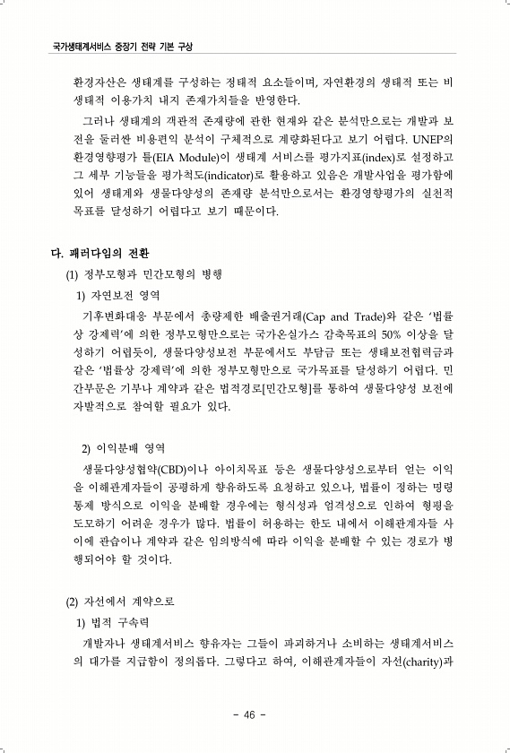 국가생태계서비스 중장기 전략 기본 구상 46 환경자산은 생태계를 구성하는 정태적 요소들이며, 자연환경의 생태적 또는 비 생태적 이용가치 내지 존재가치들을 반영한다. 그러나 생태계의 객관적 존재량에 관한 현재와 같은 분석만으로는 개발과 보 전을 둘러싼 비용편익 분석이 구체적으로 계량화된다고 보기 어렵다. UNEP의 환경영향평가 틀 EIA Module 이 생태계 서비스를 평가지표 index 로 설정하고 그 세부 기능들을 평가척도 indicator 로 활용하고 있음은 개발사업을 평가함에 있어 생태계와 생물다양성의 존재량 분석만으로서는 환경영향평가의 실천적 목표를 달성하기 어렵다고 보기 때문이다. 다. 패러다임의 전환 1 정부모형과 민간모형의 병행 1 자연보전 영역 기후변화대응 부문에서 총량제한 배출권거래 Cap ...