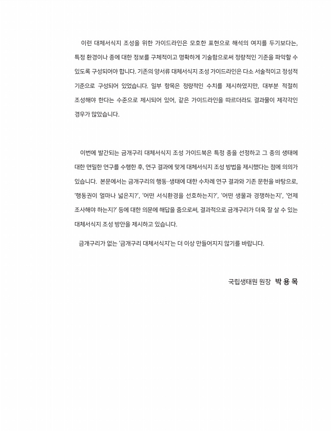 이런 대체서식지 조성을 위한 가이드라인은 모호한 표현으로 해석의 여지를 두기보다는, 특정 환경이나 종에 대한 정보를 구체적이고 명확하게 기술함으로써 정량적인 기준을 파악할 수 있도록 구성되어야 합니다. 기존의 양서류 대체서식지 조성 가이드라인은 다소 서술적이고 정성적 기준으로 구성되어 있었습니다. 일부 항목은 정량적인 수치를 제시하였지만, 대부분 적절히 조성해야 한다는 수준으로 제시되어 있어, 같은 가이드라인을 따르더라도 결과물이 제각각인 경우가 많았습니다. 이번에 발간되는 금개구리 대체서식지 조성 가이드북은 특정 종을 선정하고 그 종의 생태에 대한 면밀한 연구를 수행한 후, 연구 결과에 맞게 대체서식지 조성 방법을 제시했다는 점에 의의가 있습니다. 본문에서는 금개구리의 행동·생태에 대한 수차례 연구 결과와...
