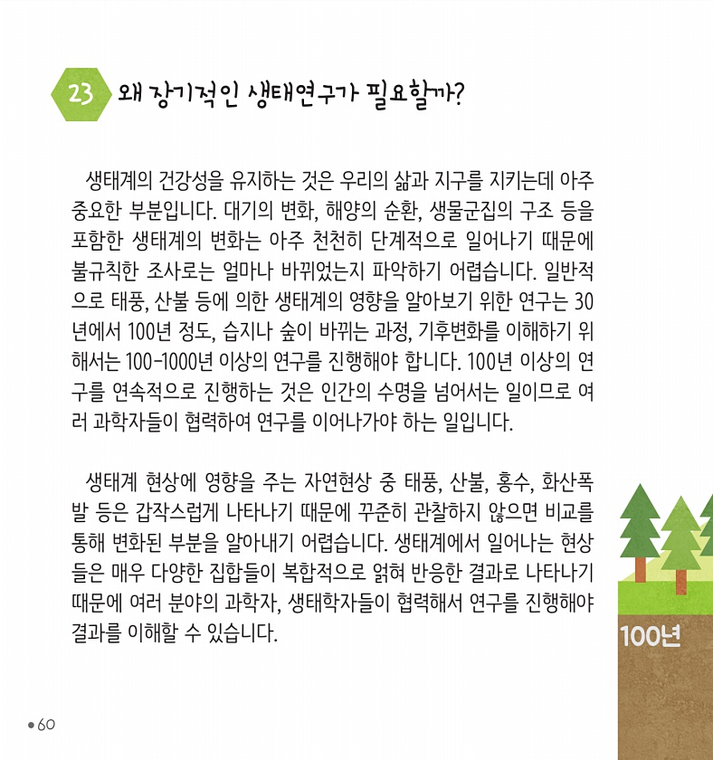 ●60 23 100년 생태계의 건강성을 유지하는 것은 우리의 삶과 지구를 지키는데 아주 중요한 부분입니다. 대기의 변화, 해양의 순환, 생물군집의 구조 등을 포함한 생태계의 변화는 아주 천천히 단계적으로 일어나기 때문에 불규칙한 조사로는 얼마나 바뀌었는지 파악하기 어렵습니다. 일반적 으로 태풍, 산불 등에 의한 생태계의 영향을 알아보기 위한 연구는 30 년에서 100년 정도, 습지나 숲이 바뀌는 과정, 기후변화를 이해하기 위 해서는 100-1000년 이상의 연구를 진행해야 합니다. 100년 이상의 연 구를 연속적으로 진행하는 것은 인간의 수명을 넘어서는 일이므로 여 러 과학자들이 협력하여 연구를 이어나가야 하는 일입니다. 생태계 현상에 영향을 주는 자연현상 중 태풍, 산불, 홍수, 화산폭 발 등은 갑작스럽게...