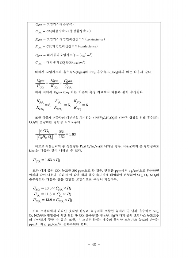 40 ??? 오염가스의흡수속도 의흡수속도총광합성속도 ??? 오염가스의엽면확산전도도 ??????????? 의엽면확산전도도 ??????????? ??? 대기중의오염가스농도??? 대기중의농도??? 따라서 오염가스의 흡수속도 와 흡수속도 와의 비는 다음과 같다 ??? ??? × ??? 위의 식에서 비는 기존의 측정 자료에서 다음과 같이 추정된다 또한 식물체 건중량의 대부분을 차지하는 다당류 와 다당류 합성을 위해 흡수하는 의 중량비는 광합성 식으로부터 ...