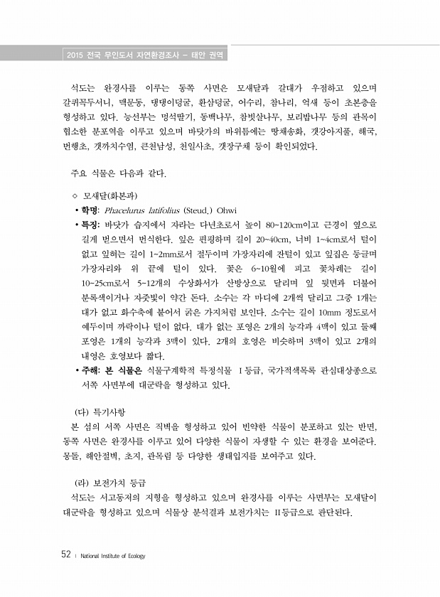 2015 전국 무인도서 자연환경조사 태안 권역 52 ? National Institute of Ecology 석도는 완경사를 이루는 동쪽 사면은 모새달과 갈대가 우점하고 있으며 갈퀴꼭두서니, 맥문동, 댕댕이덩굴, 환삼덩굴, 어수리, 참나리, 억새 등이 초본층을 형성하고 있다. 능선부는 멍석딸기, 동백나무, 참빗살나무, 보리밥나무 등의 관목이 협소한 분포역을 이루고 있으며 바닷가의 바위틈에는 땅채송화, 갯강아지풀, 해국, 번행초, 갯까치수염, 큰천남성, 천일사초, 갯장구채 등이 확인되었다. 주요 식물은 다음과 같다. ◇ 모새달 화본과 ? 학명Phacelurus latifolius Steud. Ohwi ? 특징바닷가 습지에서 자라는 다년초로서 높이 80120cm이고 근경이 옆으로 길게 벋으면서 번식한다. 잎은 ...