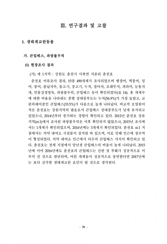 36 Ⅲ. 연구결과 및 고찰 1. 생태계교란동물 가. 큰입배스, 파랑볼우럭 1 현장조사 결과 가 제 1지역 강원도 춘천시 사북면 지촌리 춘천호 춘천호 어류조사 결과, 15종 490개체가 조사되었으며 뱀장어, 떡붕어, 잉 어, 붕어, 줄납자루, 돌고기, 중고기, 누치, 참마자, 모래무지, 피라미, 눈동자 개, 민물검정망둑, 파랑볼우럭, 큰입배스 등이 확인되었다 표 14 총 개체수 에 대한 비율을 나타내는 종별 상대풍부도는 누치 56.9% 가 가장 높았고, 교 란외래어종인 큰입배스 33.5% 가 다음으로 높게 나타났다. 비교적 오염원이 적은 춘천호는 강원지역의 댐호로서 큰입배스 상대풍부도가 낮게 유지되고 있었으나, 2014년부터 증가하는 경향이 확인되고 있다. 2012년 춘천호 상류 지역 st.1 에서 조사된 ...