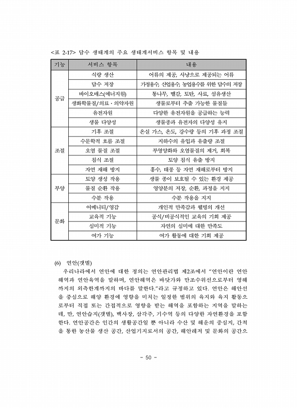 50 기능 서비스 항목 내용 공급 식량 생산 어류의 제공 사냥으로 제공되는 어류 담수 저장 가정용수 산업용수 농업용수를 위한 담수의 저장 바이오매스 에너지원 통나무 땔감 토탄 사료 섬유생산 생화학물질 의료 의약자원 생물로부터 추출 가능한 물질들 유전자원 다양한 유전자원을 공급하는 능력 생물 다양성 생물종과 유전자의 다양성 유지 조절 기후 조절 온실 가스 온도 강수량 등의 기후 과정 조절 수문학적 흐름 조절 지하수의 유입과 유출량 조절 오염 물질 조절 부영양화와 오염물질의 제거 회복 침식 조절 토양 침식 유출 방지 자연 재해 방지 홍수 태풍 등 자연 재해로부터 방지 부양 토양 생성 작용 생물 종이 보호될 수 있는 환경 제공 물질 순환 작용 영양분의 저장 순환 과정을 지지 수분 작용 수분 작용을 지지 문화 어메...