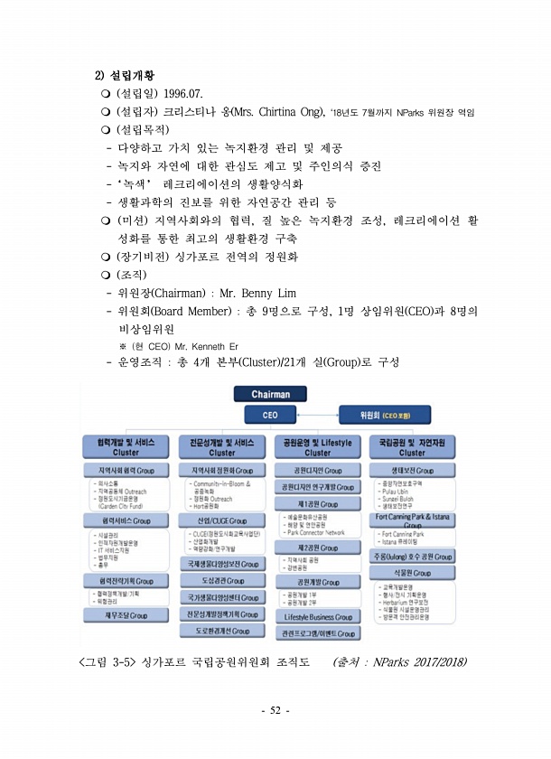 52 2 설립개황 ?? 설립일 1996.07. ?? 설립자 크리스티나 옹 Mrs. Chirtina Ong , ‘18년도 7월까지 NParks 위원장 역임 ?? 설립목적 다양하고 가치 있는 녹지환경 관리 및 제공 녹지와 자연에 대한 관심도 제고 및 주인의식 증진 -‘녹색’ 레크리에이션의 생활양식화 생활과학의 진보를 위한 자연공간 관리 등 ?? 미션 지역사회와의 협력, 질 높은 녹지환경 조성, 레크리에이션 활 성화를 통한 최고의 생활환경 구축 ?? 장기비전 싱가포르 전역의 정원화 ?? 조직 위원장 Chairman Mr. Benny Lim 위원회 Board Member 총 9명으로 구성, 1명 상임위원 CEO 과 8명의 비상임위원 ※ 현 CEO Mr. Kenneth Er 운영조직 총 4개 본부 Cluster /2...