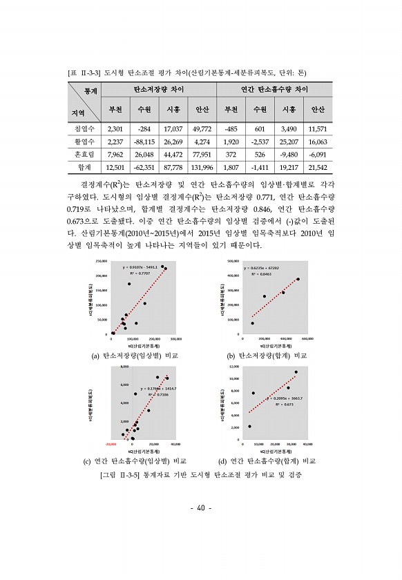 40 통계 지역 탄소저장량 차이 연간 탄소흡수량 차이 부천 수원 시흥 안산 부천 수원 시흥 안산 침엽수 2,301 -284 17,037 49,772 -485 601 3,490 11,571 활엽수 2,237 -88,115 26,269 4,274 1,920 -2,537 25,207 16,063 혼효림 7,962 26,048 44,472 77,951 372 526 -9,480 -6,091 합계 12,501 -62,351 87,778 131,996 1,807 -1,411 19,217 21,542 [표 Ⅱ-3-3] 도시형 탄소조절 평가 차이 산림기본통계-세분류피복도, 단위톤 결정계수 R2 는 탄소저장량 및 연간 탄소흡수량의 임상별·합계별로 각각 구하였다. 도시형의 임상별 결정계수 R2 는 탄소저장량 0.771, 연간...