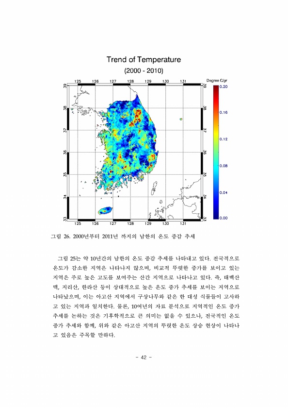 42 그림 26. 2000년부터 2011년 까지의 남한의 온도 증감 추세 그림 25는 약 10년간의 남한의 온도 증감 추세를 나타내고 있다. 전국적으로 온도가 감소한 지역은 나타나지 않으며, 비교적 뚜렷한 증가를 보이고 있는 지역은 주로 높은 고도를 보여주는 산간 지역으로 나타나고 있다. 즉, 태백산 맥, 지리산, 한라산 등이 상대적으로 높은 온도 증가 추세를 보이는 지역으로 나타났으며, 이는 아고산 지역에서 구상나무와 같은 한 대성 식물들이 고사하 고 있는 지역과 일치한다. 물론, 10여년의 자료 분석으로 지역적인 온도 증가 추세를 논하는 것은 기후학적으로 큰 의미는 없을 수 있으나, 전국적인 온도 증가 추세와 함께, 위와 같은 아고산 지역의 뚜렷한 온도 상승 현상이 나타나 고 있음은 주목할만하다.