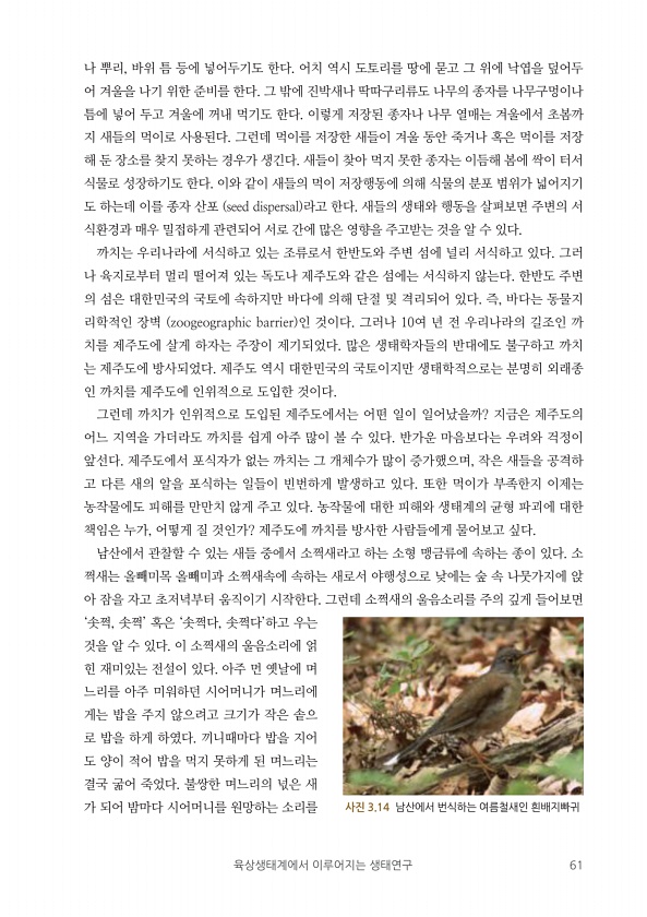 육상생태계에서 이루어지는 생태연구 61 나 뿌리, 바위 틈 등에 넣어두기도 한다. 어치 역시 도토리를 땅에 묻고 그 위에 낙엽을 덮어두 어 겨울을 나기 위한 준비를 한다. 그 밖에 진박새나 딱따구리류도 나무의 종자를 나무구멍이나 틈에 넣어 두고 겨울에 꺼내 먹기도 한다. 이렇게 저장된 종자나 나무 열매는 겨울에서 초봄까 지 새들의 먹이로 사용된다. 그런데 먹이를 저장한 새들이 겨울 동안 죽거나 혹은 먹이를 저장 해 둔 장소를 찾지 못하는 경우가 생긴다. 새들이 찾아 먹지 못한 종자는 이듬해 봄에 싹이 터서 식물로 성장하기도 한다. 이와 같이 새들의 먹이 저장행동에 의해 식물의 분포 범위가 넓어지기 도 하는데 이를 종자 산포 seed dispersal 라고 한다. 새들의 생태와 행동을 살펴보면 주변의 서 식환...