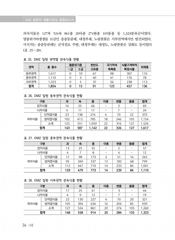 DMZ 일원의 생물다양성 종합보고서 36 피자식물은 127과 524속 861종 20아종 274변종 105품종 등 1,323분류군이었다. 멸종위기야생생물 Ⅱ급인 층층둥굴레, 대청부채, 노랑붓꽃은 서부권역에서만 발견되었다. 서식지는 층층둥굴레는 군작전로 주변, 대청부채는 대청도, 노랑붓꽃은 강화도 등이었다 표 25∼28 권역 총 종수 멸종위기종 한반도 고유종 국가적색 목록종 식물구계학적 Ⅰ급 Ⅱ급 특정식물 외래종 동부권역 1,617 0 10 67 98 307 110 중부권역 1,110 0 3 40 41 176 78 서부권역 1,323 0 5 37 56 238 113 합계 1,854 0 15 91 125 457 136 표 25. DMZ 일원 권역별 관속식물 현황 구분 과 속 종 아종 변종 품종 합계 양치식물 14...
