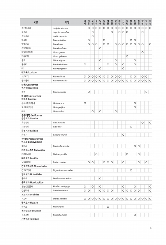 61 붉은배새매 Accipiter soloensis ○ ○ ○ ○ ○ ○ ○ ○ ○ ○ ○ ○ ○ ○ ○ ○ ○ 독수리 Aegypius monachus ○ ○ ○ ○ ○ ○ 검독수리 Aquila chrysaetos ○ 왕새매 Butastur indicus ○ ○ ○ ○ 말똥가리 Buteo buteo ○ ○ ○ ○ ○ ○ ○ ○ ○ ○ ○ ○ ○ ○ 큰말똥가리 Buteo hemilasius ○ 잿빛개구리매 Circus cyaneus ○ 개구리매 Circus spilonotus ○ 솔개 Milvus migrans ○ ○ ○ 물수리 Pandion haliaetus ○ ○ ○ ○ ○ 매 Falco peregrinus ○ ○ 매과 Falconidae 새호리기 Falco subbuteo ○ ○ ○ ○ ○ ○ ○ ○ ○...