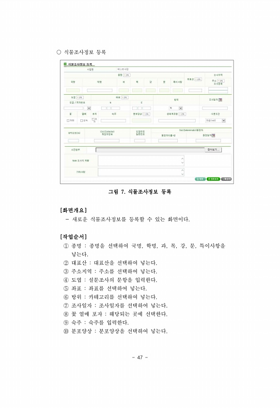 47 ○ 식물조사정보 등록 그림 7. 식물조사정보 등록 [화면개요] 새로운 식물조사정보를 등록할 수 있는 화면이다. [작업순서] ① 종명 종명을 선택하여 국명, 학명, 과, 목, 강, 문, 특이사항을 넣는다. ② 대표산 대표산을 선택하여 넣는다. ③ 주소지역 주소를 선택하여 넣는다. ④ 도엽 설문조사의 문항을 입력한다. ⑤ 좌표 좌표를 선택하여 넣는다. ⑥ 방위 카테고리를 선택하여 넣는다. ⑦ 조사일자 조사일자를 선택하여 넣는다. ⑧ 꽃 열매 포자 해당되는 곳에 선택한다. ⑨ 숙주 숙주를 입력한다. ⑩ 분포양상 분포양상을 선택하여넣는다.
