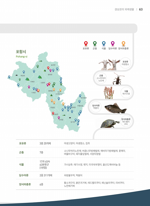 담수어류 떡붕어 포항시 Pohang-si 죽장면 기북면 기계면 신광면 청하면 송라면 홍해읍 시내동지구 시내동지구 연일읍 대송면 오천읍 장기면 구릉포읍 동해면 호미곶면 포유류 3종 20개체 야생고양이, 야생염소, 집쥐 곤충 7종 소나무허리노린재, 버즘나무방패벌레, 해바라기방패벌레, 꽃매미, 벼물바구미, 돼지풀잎벌레, 서양뒤영벌 식물 17과 45속 63분류군 1변종 가시상추, 애기수영, 벳지, 미국쑥부쟁이, 울산도깨비바늘 등 담수어류 2종 311개체 파랑볼우럭, 떡붕어 양서파충류 6종 황소개구리, 붉은귀거북, 레드벨리쿠터, 페닌슐라쿠터, 리버쿠터, 노란배거북 포유류 곤충 식물 담수어류 양서파충류 식물 애기수영 양서파충류 레드벨리 쿠터 곤충 소나무허리 노린재 포유류 야생염소 경상권의 외래생물63