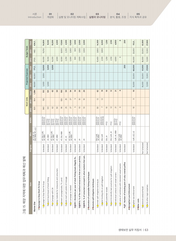 생태보전 실무 지침서 | 63 서론 Introduction 01 개념화 02 실행 및 모니터링 계획수립 03 실행과 모니터링 04 분석, 활용, 조정 05 지식 획득과 공유 Work Units Projented Expenses Budget Totals Item Progress Who WHEN 2012 2013 Total 2012 2013 Total 2012 2013 Total Marine Site JH, GdR, LE, EM, MIM, AT, LE2 820 564 1,384 99,500 66,500 171,2... 270,9... 148,1... 424,3... 1. Campaign to Stop Shark fin Soup 1. Campaign to Stop Shark fin Soup Scheduled AT...