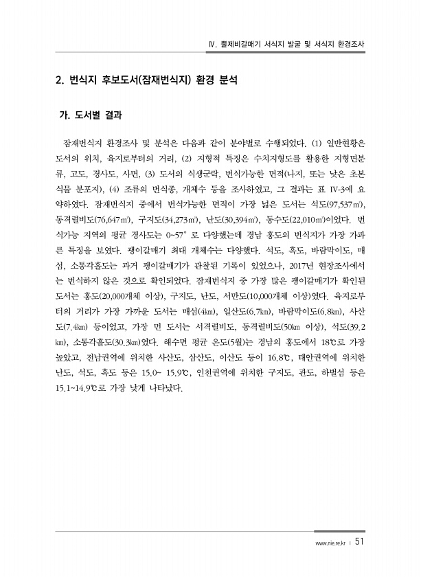 Ⅳ. 뿔제비갈매기 서식지 발굴 및 서식지 환경조사 www.nie.re.kr ? 51 2. 번식지 후보도서 잠재번식지 환경 분석 가. 도서별 결과 잠재번식지 환경조사 및 분석은 다음과 같이 분야별로 수행되었다. 1 일반현황은 도서의 위치, 육지로부터의 거리, 2 지형적 특징은 수치지형도를 활용한 지형면분 류, 고도, 경사도, 사면, 3 도서의 식생군락, 번식가능한 면적 나지, 또는 낮은 초본 식물 분포지 , 4 조류의 번식종, 개체수 등을 조사하였고, 그 결과는 표 Ⅳ-3에 요 약하였다. 잠재번식지 중에서 번식가능한 면적이 가장 넓은 도서는 석도 97,537㎡ , 동격렬비도 76,647㎡ , 구지도 34,273㎡ , 난도 30,394㎡ , 동수도 22,010㎡ 이었다. 번 식가능 지역의 평균 경사도는 057°...