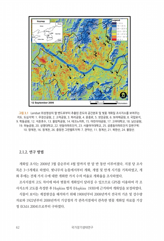 62 국가장기생태연구 2.1.2. 연구 방법 개화일 조사는 2008년 3월 중순부터 4월 말까지 한 달 반 동안 이루어졌다. 지점 당 조사 목은 35개체로 하였다. 벚나무의 눈틈에서부터 개화, 개엽 및 만개 시기를 기록하였고, 개 화 후에는 전체 가지 수에 대한 개화한 가지 수의 비율로 개화율을 조사하였다. 조사지점의 고도 차이에 따라 벚꽃의 개화일이 달라질 수 있으므로 GPS를 이용하여 각 조 사지소의 고도를 측정한 후 Hopkins 법칙 Hopkins 1930 에 근거하여 개화일을 보정하였다. 식물이 보이는 계절현상을 해석하기 위해 1908년부터 2008년까지 전국의 기온 및 강수량 자료와 1922년부터 2008년까지 기상청의 각 관측지점에서 관측한 벚꽃 개화일 자료를 기상 청 KMA 2004 으로부터 ...