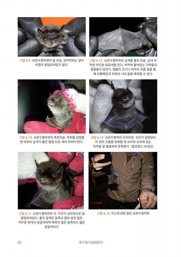 62 국가장기생태연구 그림 6.9 쇠큰수염박쥐의 앞 모습. 관박쥐와는 달리 비엽이 발달되어있지 않다. 그림 6.12 쇠큰수염박쥐의 날개를 펼친 모습. 날개 비 막은 어두운 회갈색을 띤다. 비막에 붙어있는 가락들과 힘줄들이 보인다. 힘줄의 크기나 비막의 주름 등을 통 해 비행패턴과 박쥐의 나이 등을 예측할 수 있다. 그림 6.10 쇠큰수엽박쥐의 측면모습. 박쥐를 관찰할 땐 박쥐의 날개가 붙은 팔을 뒤로 제쳐 쥐어야 한다. 그림 6.13 쇠큰수염박쥐 꼬리모양. 꼬리가 잘발달되 어 있어 곤충을 포획할 때 꼬리와 꼬리에 있는 비막을 잘 활용하여 포획한다. 발견장소오대산 그림 6.11 쇠큰수염박쥐의 귀. 이주가 상대적으로 잘 발달되어있다. 몸의 털색은 등쪽과 몸의 윗면 털은 어두운 회색과 암갈색이며 배쪽의 털은 등쪽...