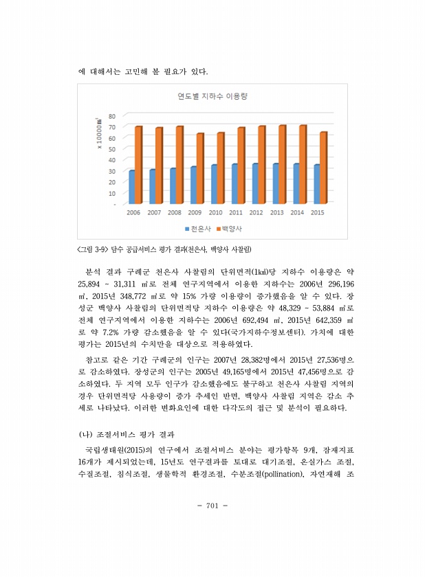 701 에 대해서는 고민해 볼 필요가 있다. 그림 3-9 담수 공급서비스 평가 결과 천은사, 백양사 사찰림 분석 결과 구례군 천은사 사찰림의 단위면적 1㎢ 당 지하수 이용량은 약 25,894 31,311 ㎥로 전체 연구지역에서 이용한 지하수는 2006년 296,196 ㎥, 2015년 348,772 ㎥로 약 15% 가량 이용량이 증가했음을 알 수 있다. 장 성군 백양사 사찰림의 단위면적당 지하수 이용량은 약 48,329 53,884 ㎥로 전체 연구지역에서 이용한 지하수는 2006년 692,494 ㎥, 2015년 642,359 ㎥ 로 약 7.2% 가량 감소했음을 알 수 있다 국가지하수정보센터 가치에 대한 평가는 2015년의 수치만을 대상으로 적용하였다. 참고로 같은 기간 구례군의 인구는 2007년 28,382명...