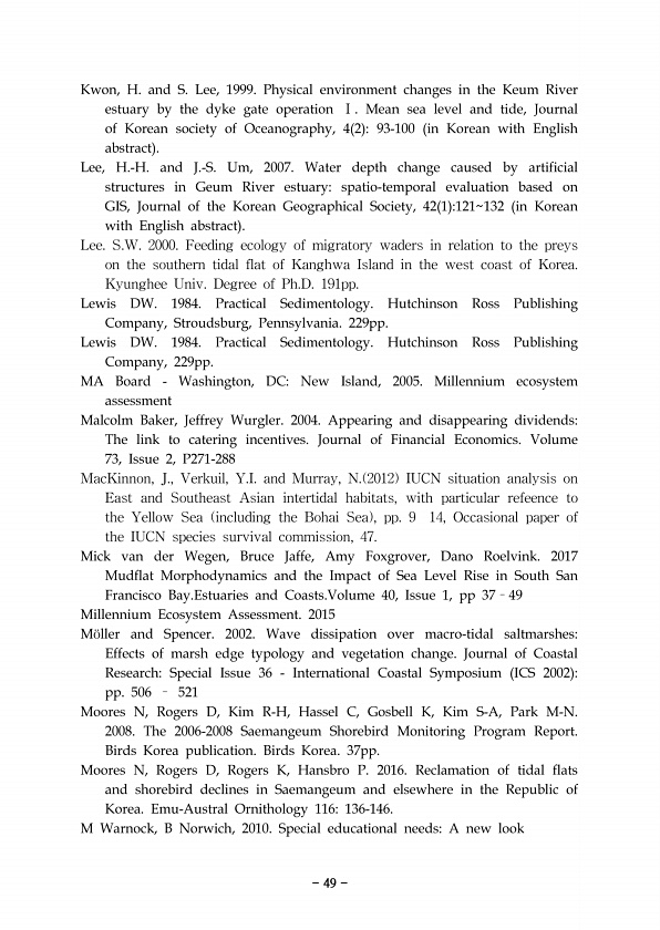 Kwon, H. and S. Lee, 1999. Physical environment changes in the Keum River estuary by the dyke gate operation Ⅰ. Mean sea level and tide, Journal of Korean society of Oceanography, 4 2 93-100 in Korean with English abstract Lee, H.-H. and J.-S. Um, 2007. Water depth change caused by artificial structures in Geum River estuaryspatio-temporal evaluation based on GIS, Journal of the Korean Geographica...