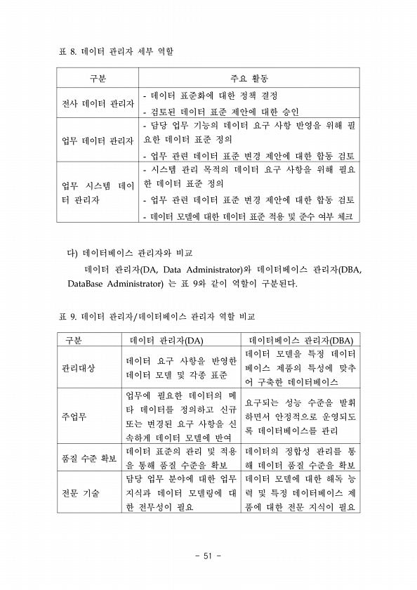 표 8. 데이터 관리자 세부 역할 구분 주요 활동 전사 데이터 관리자 데이터 표준화에 대한 정책 결정 검토된 데이터 표준 제안에 대한 승인 업무 데이터 관리자 담당 업무 기능의 데이터 요구 사항 반영을 위해 필 요한 데이터 표준 정의 업무 관련 데이터 표준 변경 제안에 대한 합동 검토 업무 시스템 데이 터 관리자 시스템 관리 목적의 데이터 요구 사항을 위해 필요 한 데이터 표준 정의 업무 관련 데이터 표준 변경 제안에 대한 합동 검토 데이터 모델에 대한 데이터 표준 적용 및 준수 여부 체크 다 데이터베이스 관리자와 비교 데이터 관리자 DA, Data Administrator 와 데이터베이스 관리자 DBA, DataBase Administrator 는 표 9와 같이 역할이 구분된다. 표 9. 데이터 관리자/데...