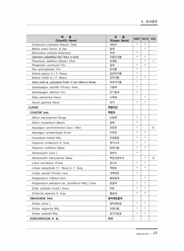 Ⅱ. 조사결과 www.nie.re.kr ? 49 학 명 Scientific Name 국 명 Korean Name 2007 2016 비고 Ischaemum crassipes Steud. Thell. 쇠보리 * * Melica onoei Franch. & Sav. 쌀새 * Miscanthus sinensis Andersson 억새 * Oplismenus undulatifolius Ard. Roem. & Schult. 주름조개풀 * * Phacelurus latifolius Steud. Ohwi 모새달 * Ⅰ Phragmites communis Trin. 갈대 * * Poa sphondylodes Trin. 포아풀 * Setaria glauca L. P. Beauv. 금강아지풀 * Setaria viridis L...
