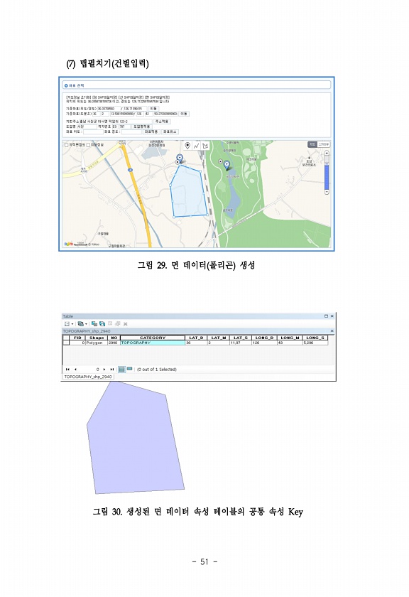 51 7 맵펼치기 건별입력 그림 29. 면 데이터 폴리곤 생성 그림 30. 생성된 면 데이터 속성 테이블의 공통 속성Key
