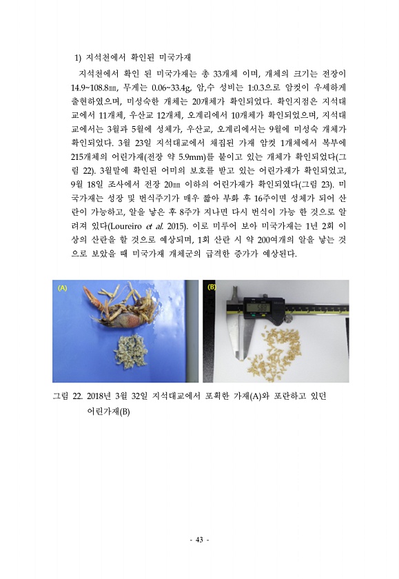 43 1 지석천에서 확인된 미국가재 지석천에서 확인 된 미국가재는 총 33개체 이며, 개체의 크기는 전장이 14.9108.8㎜, 무게는 0.0633.4g, 암,수 성비는 10.3으로 암컷이 우세하게 출현하였으며, 미성숙한 개체는 20개체가 확인되었다. 확인지점은 지석대 교에서 11개체, 우산교 12개체, 오계리에서 10개체가 확인되었으며, 지석대 교에서는 3월과 5월에 성체가, 우산교, 오계리에서는 9월에 미성숙 개체가 확인되었다. 3월 23일 지석대교에서 채집된 가재 암컷 1개체에서 복부에 215개체의 어린가재 전장 약 5.9mm 를 붙이고 있는 개체가 확인되었다 그 림 22 3월말에 확인된 어미의 보호를 받고 있는 어린가재가 확인되었고, 9월 18일 조사에서 전장 20㎜ 이하의 어린가재가 확인되였다 그림...