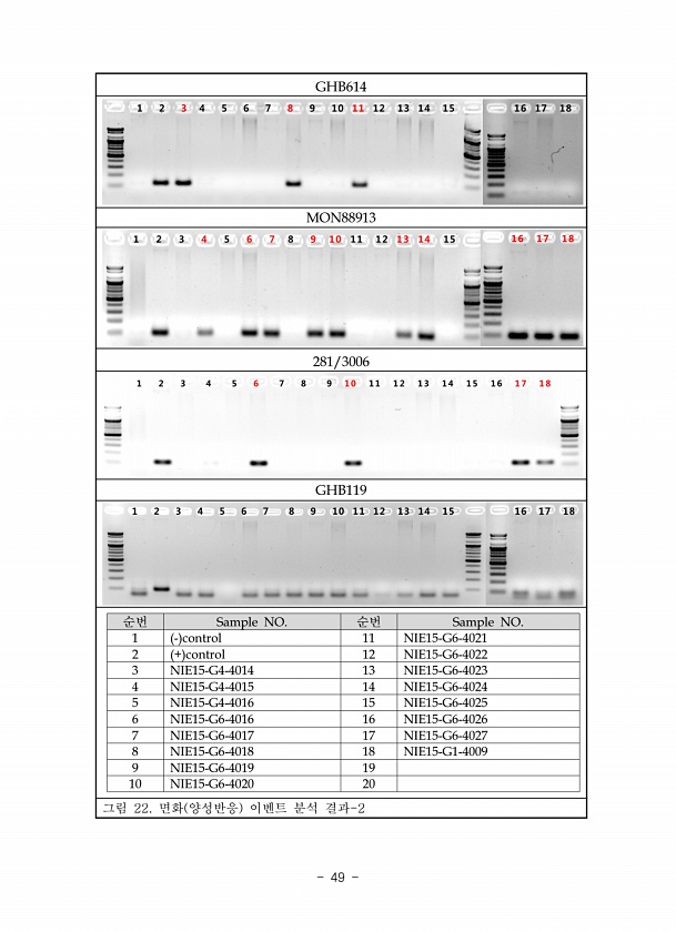 GHB614 MON88913 281/3006 GHB119 순번 Sample NO. 순번 Sample NO. 1 control 11 NIE15-G6-4021 2 + control 12 NIE15-G6-4022 3 NIE15-G4-4014 13 NIE15-G6-4023 4 NIE15-G4-4015 14 NIE15-G6-4024 5 NIE15-G4-4016 15 NIE15-G6-4025 6 NIE15-G6-4016 16 NIE15-G6-4026 7 NIE15-G6-4017 17 NIE15-G6-4027 8 NIE15-G6-4018 18 NIE15-G1-4009 9 NIE15-G6-4019 19 10 NIE15-G6-4020 20