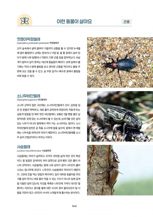 060 사슴벌레 Lucanus maculifemoratus 사슴벌레과 사슴벌레는 머리가 넓적하고 코끼리 귀처럼 넓게 퍼진 것이 특징 이다. 몸 빛깔은 갈색이며, 머리 앞쪽으로 길게 뻗은 것은 뿔이 아 니라 큰턱이다. 사슴벌레는 밤에 나와 상처가 생겨 나무진이 흘러 나오는 참나무에 모인다. 나무진이 사슴벌레의 먹이이기 때문이 다. 그런데 진을 먹는 방법이 특이하다. 입이 대부분 동물처럼 무언 가를 씹어 먹거나 혀로 핥아 먹을 수 있는 구조가 아니라 입에 갈색 털 다발만 달려 있는데, 이것을 축축한 나무진에 가져다 대기만 할 뿐이다. 리트머스 종이를 물에 대면 서서히 젖어 올라오듯이 털 다 발을 가만히 대고 나무진이 서서히 스며들게 해 흡수하는 방식이다. 소나무비단벌레 Chalcophora japonica 비단...