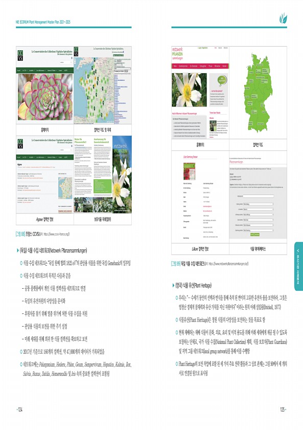 홈페이지 컬렉션 지도 Lilium 컬렉션 정보 식물 데이터베이스 [그림 89] 독일 식물 수집 네트워크 출처https//www.netzwerkpflanzensammlungen.de/ ▶ 영국 식물 유산 Plant Heritage ?? 우리는 “… 수세기 동안의 선택과 번식을 통해 축적 된 변이의 고유한 유전자 풀을 보전하라. 그것은 엄청난 경제적 잠재력과 유산 가치를 지닌 자원이다” 이라는 원칙 아래 설립됨 Brickell, 1977 ?? 식물유산 Plant Heritage 은 정원 식물의 다양성을 보전하는 것을 목표로 함 ?? 현재 재배하는 재배 식물이 문화, 의료, 요리 및 미적 용도를 위해 미래 세대에게 제공 될 수 있도록 보장하는 단체로, 국가 식물 수집 National Plant Collection...