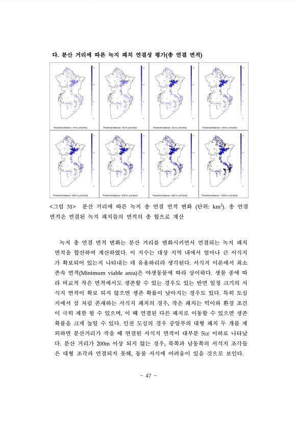 47 다. 분산 거리에 따른 녹지 패치 연결성 평가 총 연결 면적 그림 31 분산 거리에 따른 녹지 총 연결 면적 변화 단위km2 총 연결 면적은 연결된 녹지 패치들의 면적의 총 합으로 계산 녹지 총 연결 면적 변화는 분산 거리를 변화시키면서 연결되는 녹지 패치 면적을 합산하여 계산하였다. 이 지수는 대상 지역 내에서 얼마나 큰 서식지 가 확보되어 있는지 나타내는 데 유용하리라 생각된다. 서식지 이론에서 최소 존속 면적 Minimum viable area 은 야생동물에 따라 상이하다. 생물 종에 따 라 비교적 작은 면적에서도 생존할 수 있는 경우도 있는 반면 일정 크기의 서 식지 면적이 확보 되지 않으면 생존 확률이 낮아지는 경우도 있다. 특히 도심 지에서 섬 처럼 존재하는 서식지 패치의 경우, 작은 패치는...