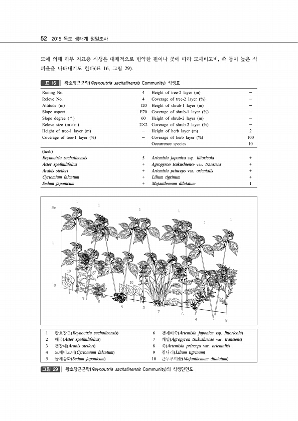 52 2015 독도 생태계 정밀조사 도에 의해 하부 지표층 식생은 대체적으로 빈약한 편이나 곳에 따라 도깨비고비, 쑥 등이 높은 식 피율을 나타내기도 한다 표 16, 그림 29 Runing No. 4 Height of tree-2 layer m - Releve No. 4 Coverage of tree-2 layer % - Altitude m 120 Height of shrub-1 layer m - Slope aspect E70 Coverage of shrub-1 layer % - Slope degree ° 60 Height of shrub-2 layer m - Releve size m×m 2×2 Coverage of shrub-2 layer % - Height of tree-1 layer m - Height...