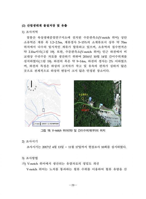 2 산림생태계 물질저장 및 유출 1 조사지역 점봉산 육상생태중점연구지소에 설치된 수문관측소 V-notch 위어 상단 소유역은 계류 폭 1.22.5m, 계류경사 515%의 소계류로서 상부 약 70m 위치에서 다수의 일시적인 계류가 합류하고 있으며, 소유역의 집수면적은 약 2.1ha이다 그림 19 또한, 수문관측소 V-notch 위어 인근 하천에서 비 교대상 수리수문 자료를 생산하기 위하여 2016년 10월 14일 간이수위계를 설치하였다 그림 19 하천의 폭은 약 914m, 하천의 경사는 2% 이하였으 며, 하천의 특징은 하상의 고저차가 작고 및 유속의 편차가 심하지 않은 곳으로 전체적으로 하상의 변동이 크지 않은 안정된 장소이다. 그림 19. V-notch 위어 좌 및 간이수위계 우 의 위치 2 조사시기 조사...