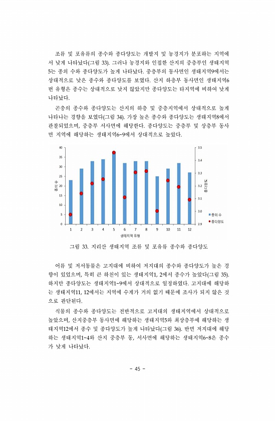 45 조류 및 포유류의 종수와 종다양도는 개발지 및 농경지가 분포하는 지역에 서 낮게 나타났다 그림 33 그러나 농경지와 인접한 산지의 중층부인 생태지역 5는 종의 수와 종다양도가 높게 나타났다. 중층부의 동사면인 생태지역9에서는 상대적으로 낮은 종수와 종다양도를 보였다. 산지 하층부 동사면인 생태지역6 번 유형은 종수는 상대적으로 낮지 않았지만 종다양도는 타지역에 비하여 낮게 나타났다. 곤충의 종수와 종다양도는 산지의 하층 및 중층지역에서 상대적으로 높게 나타나는 경향을 보였다 그림 34 가장 높은 종수와 종다양도는 생태지역8에서 관찰되었으며, 중층부 서사면에 해당한다. 종다양도는 중층부 및 상층부 동사 면 지역에 해당하는 생태지역69에서 상대적으로 높았다. 그림 33. 지리산 생태지역 조류 및 포유류 종...